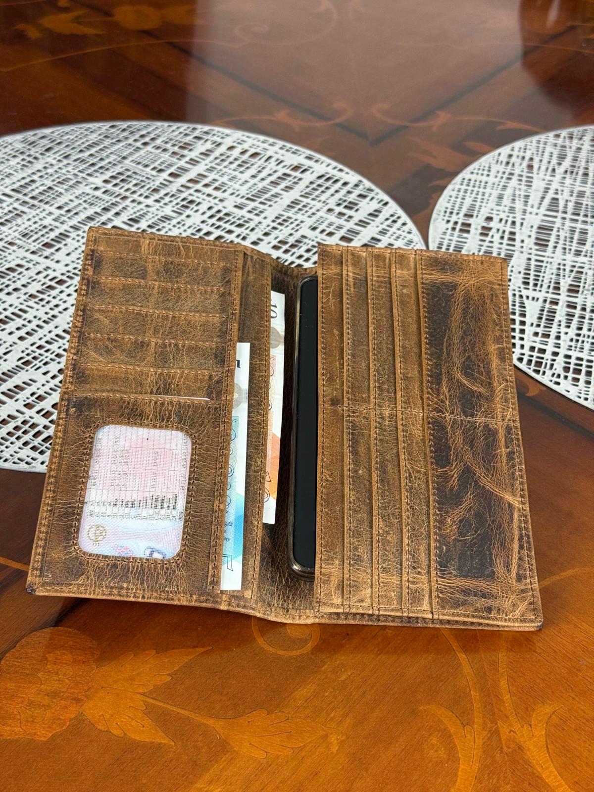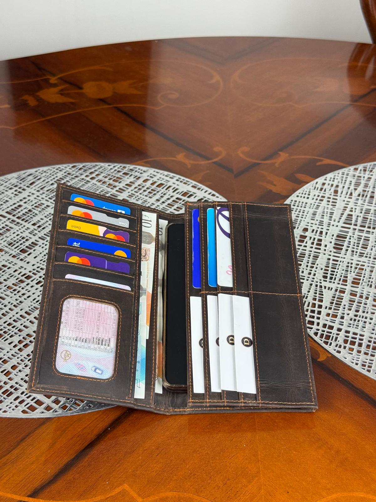 Crafted from high-quality waxed grain leather, this long wallet design keeps everything in one place — phone, cards, cash, and ID, making it perfect for minimal everyday carry.