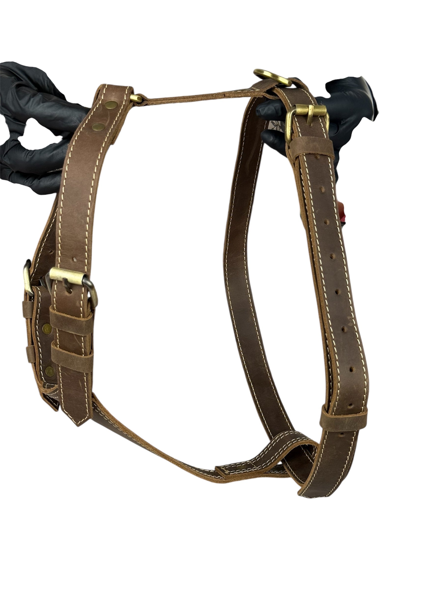 Designed to fit neck sizes from 46 cm to 60 cm and adjustable strap from 79 cm to 103 cm, this harness provides a secure yet comfortable fit for medium to large breeds. The antique brass hardware adds a touch of classic elegance while offering reliable rust resistance and long-lasting performance.
